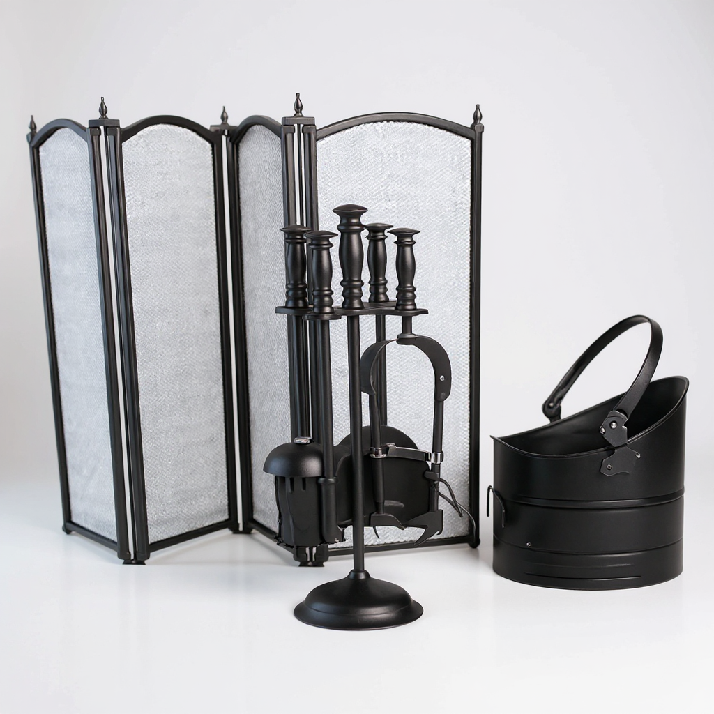 Comes with a coal bucket, 5 piece companion set, and a four fold fire section. In an all black finish.
